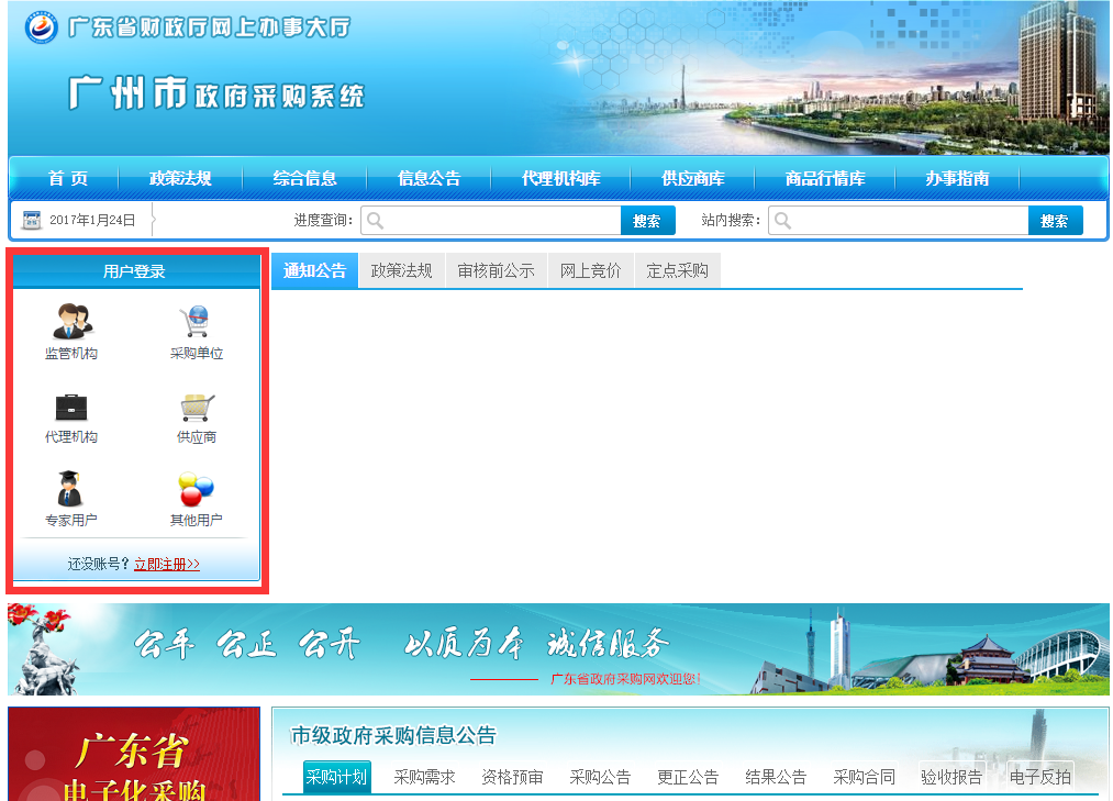 5、進(jìn)入廣州市系統后,在頁(yè)面左側找到“用戶(hù)登錄”功能欄目(如下圖紅色方框所示)