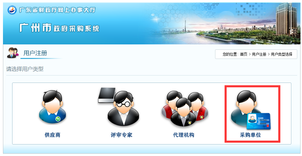 7、在新打開(kāi)的“用戶(hù)注冊”頁(yè)面中點(diǎn)擊“采購單位”圖標(如下圖紅色方框所示)。