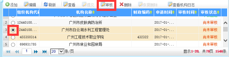 6、選擇“審核狀態(tài)”標注為“尚未審核”的單位,點(diǎn)擊該單位“組織機構”前的單選按鈕,再點(diǎn)擊