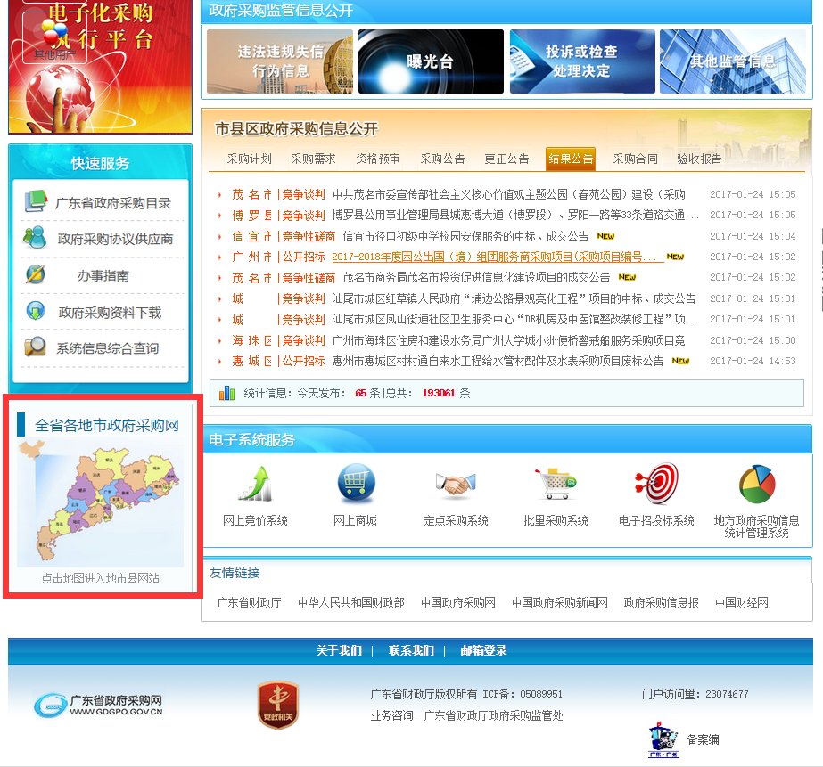 2、在頁(yè)面左側找到“全省各地市政府采購網(wǎng)”功能欄目(如下圖紅色方框所示),點(diǎn)擊地圖圖片。